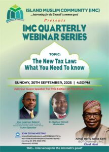 Join the IMC Quarterly Webinar titled “The New Tax Law: What You Need to Know,” featuring guest speaker Mr. Ayo Luqman Salami of KPMG West Africa and moderated by Dr. Basheer Oshodi. Happening on Sunday, 30th November 2025 at 4:30 PM. Don’t miss this insightful tax law session.